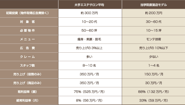 ※この比較表のデータは業界平均から算出したものです。当学院ビジネスモデルとは、当学院が応援している卒業生のサロンの平均値です。また、経常利益率にオーナー人件費は含んでいません。